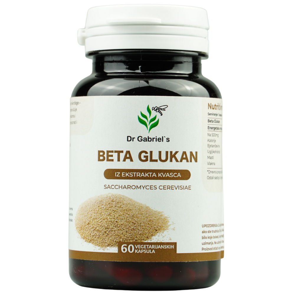 Dr Gabriel’s Beta Glukan jedna je od najpopularnijih kategorija dodataka prehrani na osnovu prirodnih polisaharida. Svaka vegetarijanska kapsula sadrži 500 mg beta glukana izoliranog iz stanične stijenke kvasca Saccharomyces cerevisiae – jednog od najproučavanijih prirodnih spojeva u oblasti nutricionizma i funkcionalne hrane.