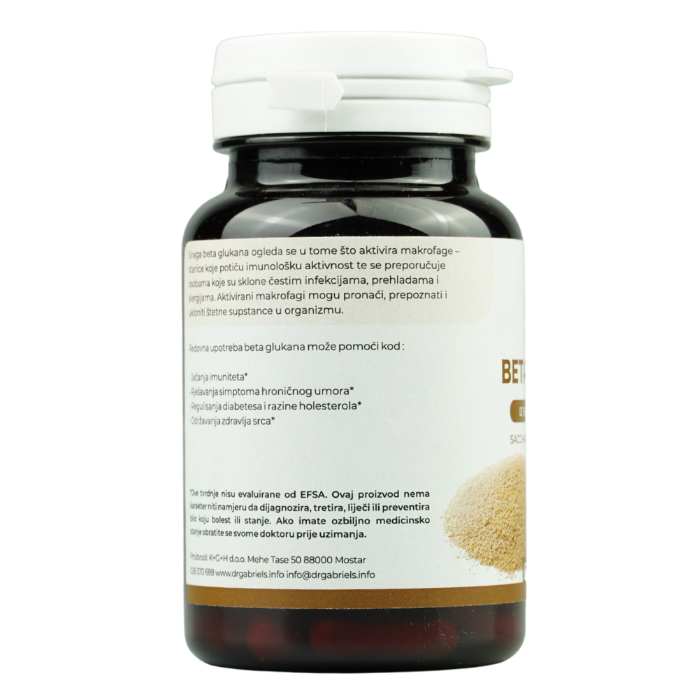 Dr Gabriel’s Beta Glukan dolazi u formi vegetarijanskih kapsula s 500 mg beta glukana po kapsuli, u praktičnom pakovanju od 60 komada. Beta glukani su prirodno prisutni polisaharidi izolirani iz stanične stijenke kvasca Saccharomyces cerevisiae, poznati po svojoj ulozi u podršci normalnom funkcionisanju imunološkog sistema.