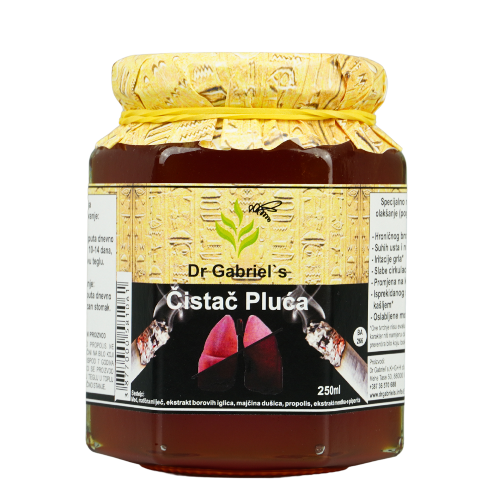 Dr Gabriel’s Čistač Pluća je prirodna medna mješavina koja podržava zdravlje disajnih puteva, doprinosi normalnoj prohodnosti bronhija i pomaže u olakšavanju iskašljavanja. Namijenjena je pušačima, bivšim pušačima te svima koji žele prirodnu podršku za funkciju pluća.