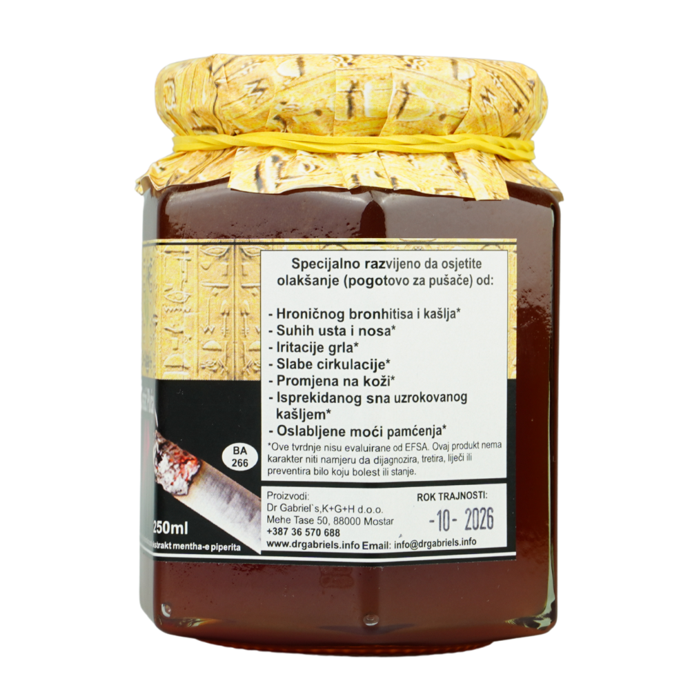 Dr Gabriel’s Čistač Pluća je prirodni preparat na bazi meda koji doprinosi normalnoj funkciji disajnih puteva i podržava prirodne procese organizma u održavanju prohodnosti bronhija. Formulacija je posebno prilagođena potrebama pušača, bivših pušača te osoba koje su svakodnevno izložene zagađenom zraku ili prašini.