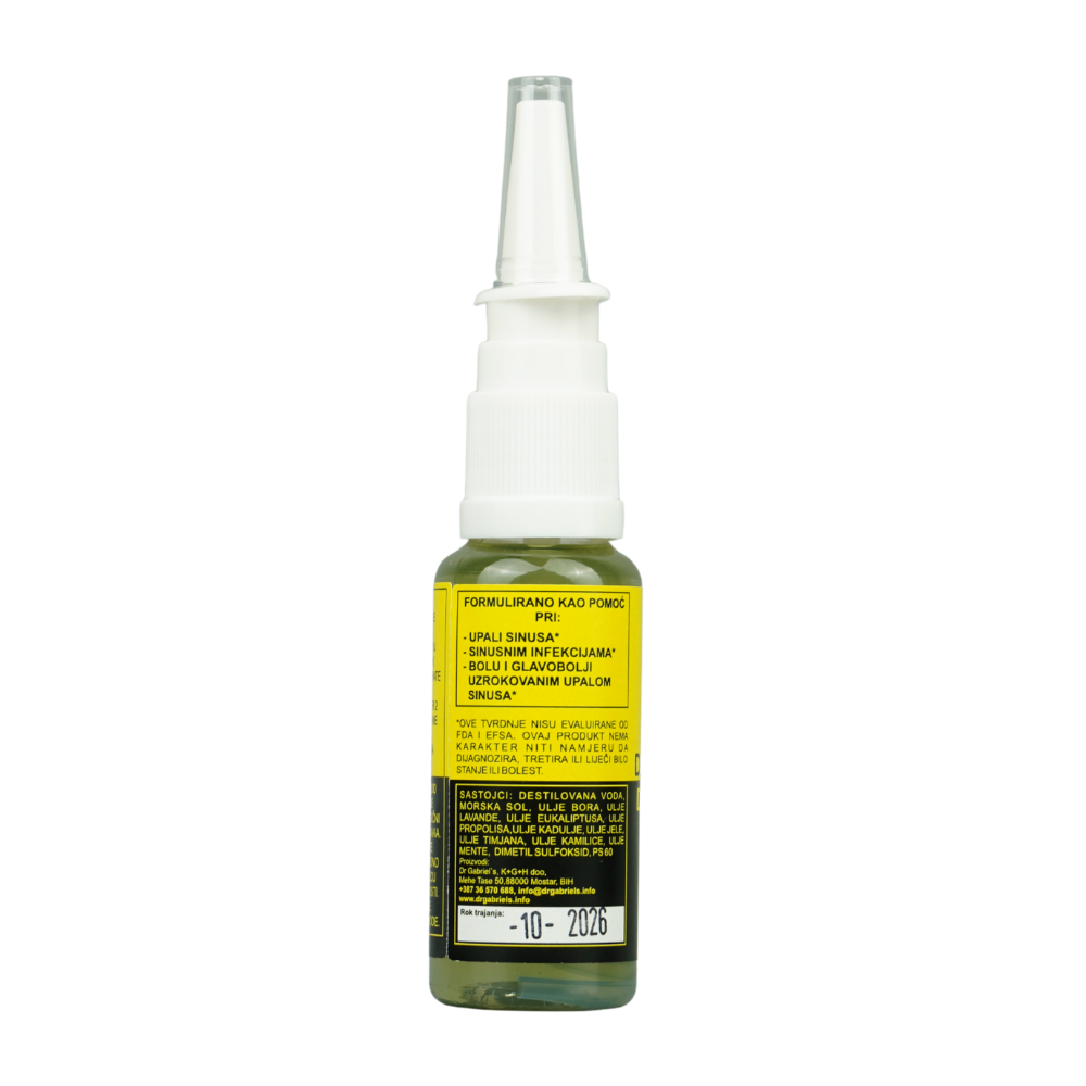 Dr Gabriel’s Deblokator Sinusa prirodni je sprej koji pomaže u održavanju prohodnosti nosnih i sinusnih puteva. Zahvaljujući spoju 12 aktivnih sastojaka biljnog i prirodnog porijekla, ovaj preparat podržava normalne funkcije gornjih dišnih puteva i pridonosi osjećaju lakšeg disanja kod osoba koje povremeno osjećaju nelagodu zbog začepljenog nosa ili povećane osjetljivosti nosne sluznice.