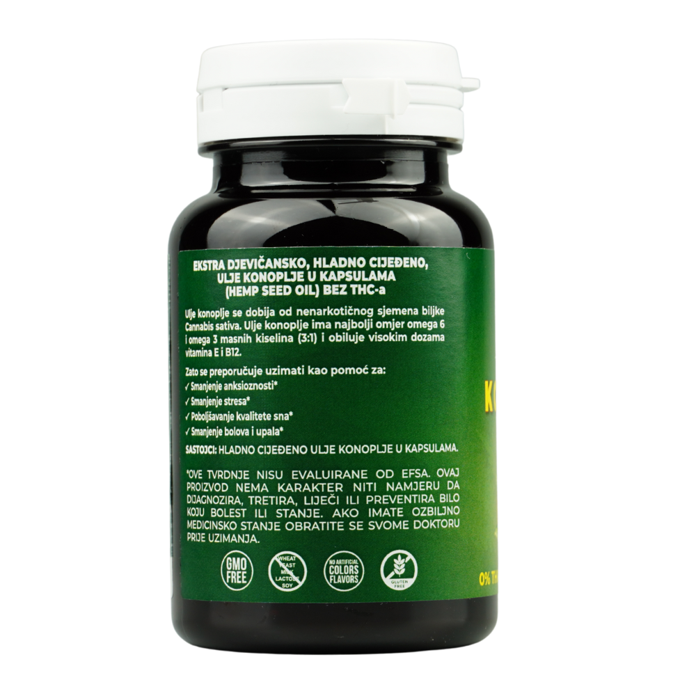 | Sadržaj po kapsuli | 800 mg ulja konoplje | Hladno cijeđeno |