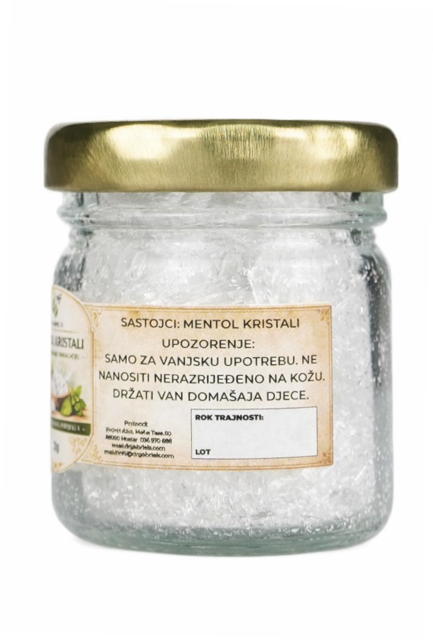 Pakovanje: 20g staklena teglica (dovoljna za desetine primjena). Sastav: 100% prirodni mentol (Menthol).