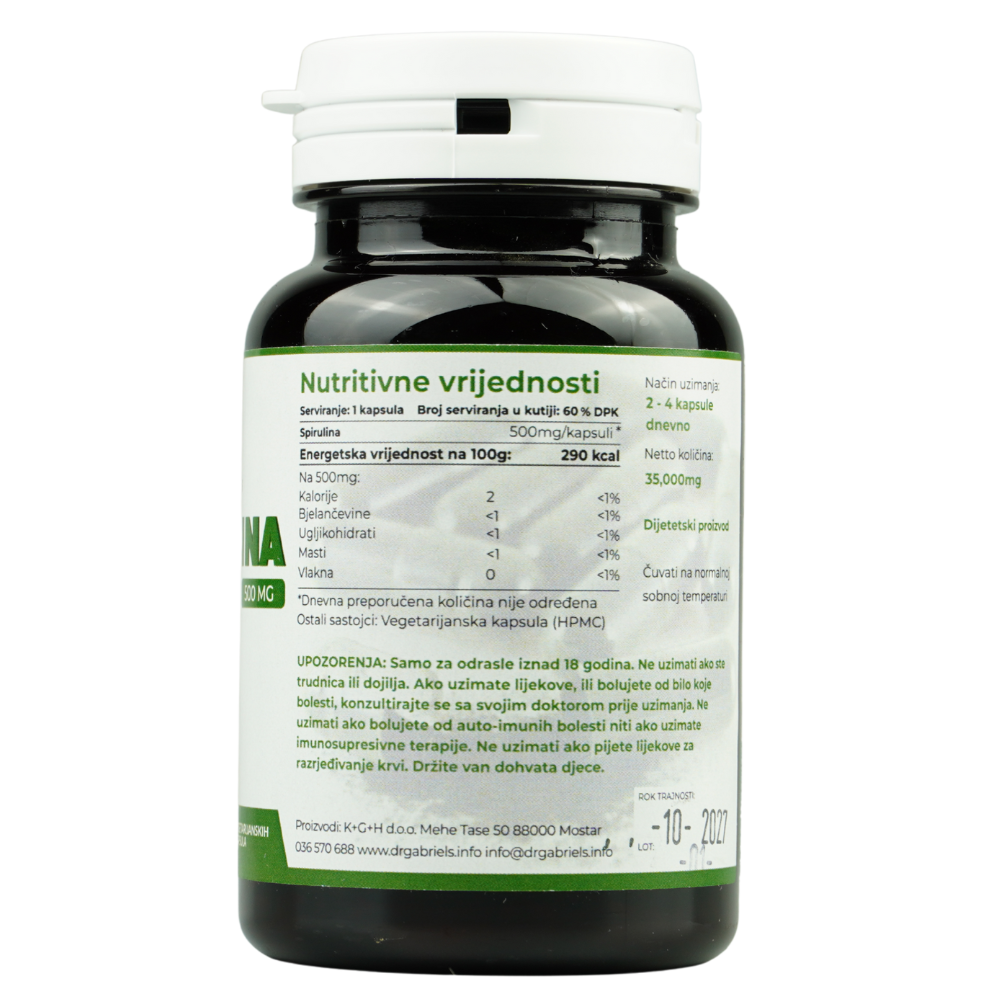 - Precizno odmjerenih 500mg čiste spiruline u svakoj kapsuli.