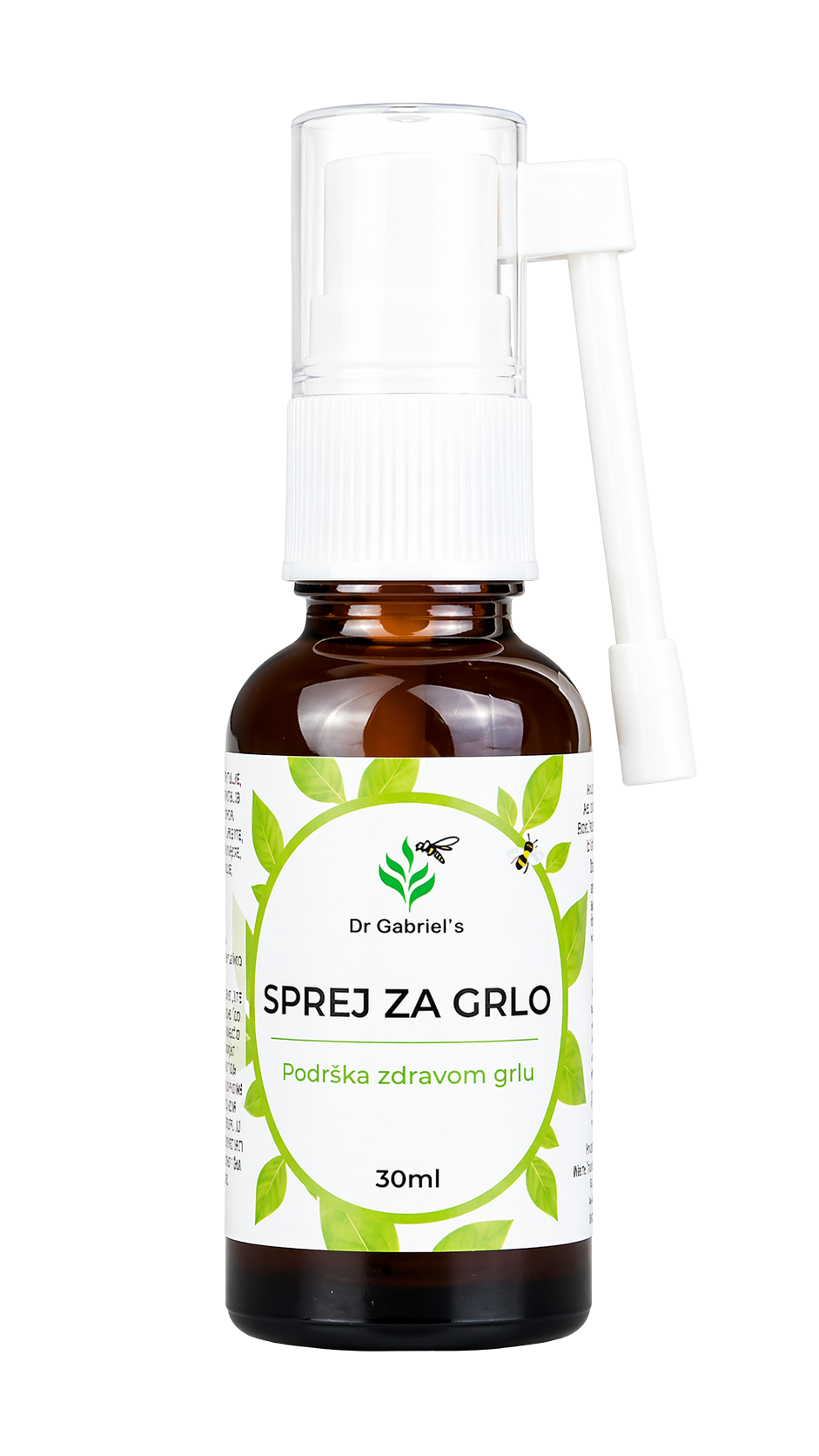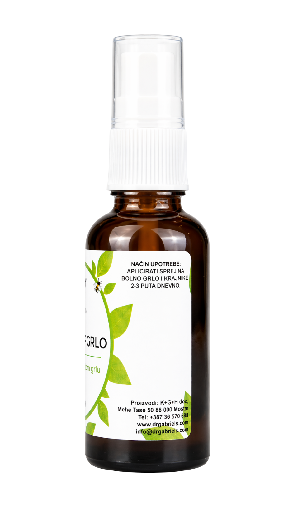 Dr Gabriel’s Sprej za Grlo je biljni preparat u obliku oralnog spreja, pakovan u tamnu staklenu bočicu od 30ml s preciznom mlaznicom za direktnu aplikaciju na grlo i krajnike. Proizvod je razvijen u okviru Dr Gabriel’s linije prirodnih preparata iz Mostara, te je namijenjen odraslima i djeci starijoj od 10 godina.