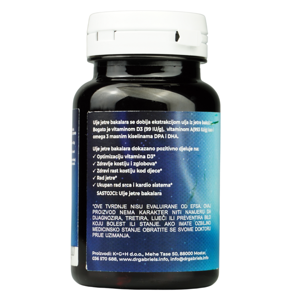 Dr Gabriel’s Ulje Jetre Bakalara Kapsule pruža sveobuhvatnu nutritivnu podršku organizmu zahvaljujući bogatom sadržaju omega-3 masnih kiselina (EPA i DHA) te vitamina A i D. Formuliran od svježe ulovljenog bakalara iz hladnih arktičkih voda, ovaj suplement doprinosi normalnoj funkciji srca, imunološkog sistema, kostiju i moždanih procesa – bez neprijatnog mirisa ili okusa.